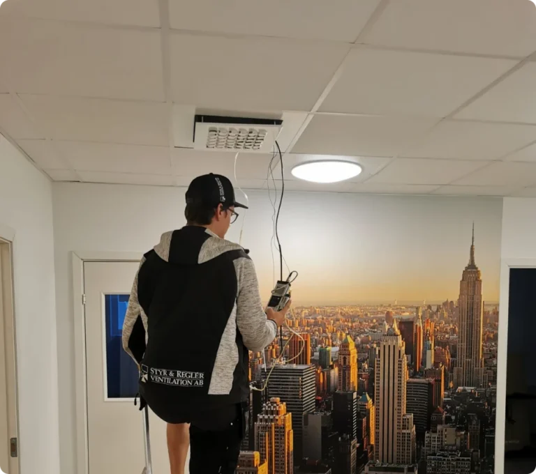 Vår certifierade kontrollant mäter luftflöden och kontrollerar att aggregat, kanaler och don fungerar enligt de regler som gällde när huset byggdes.